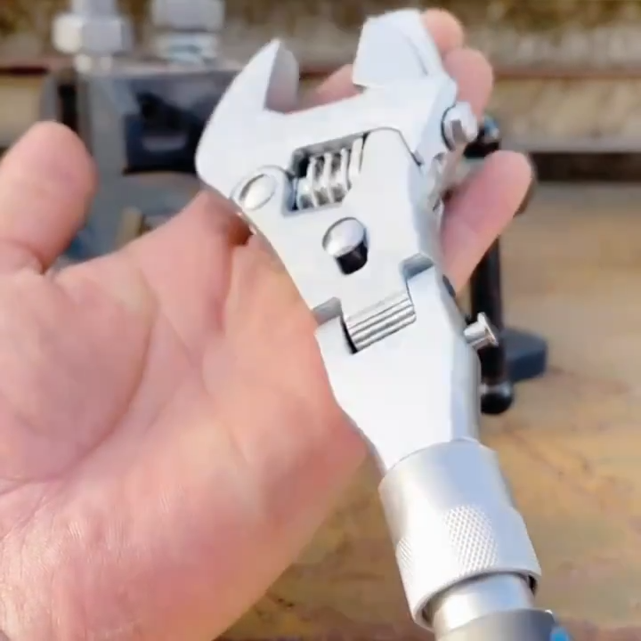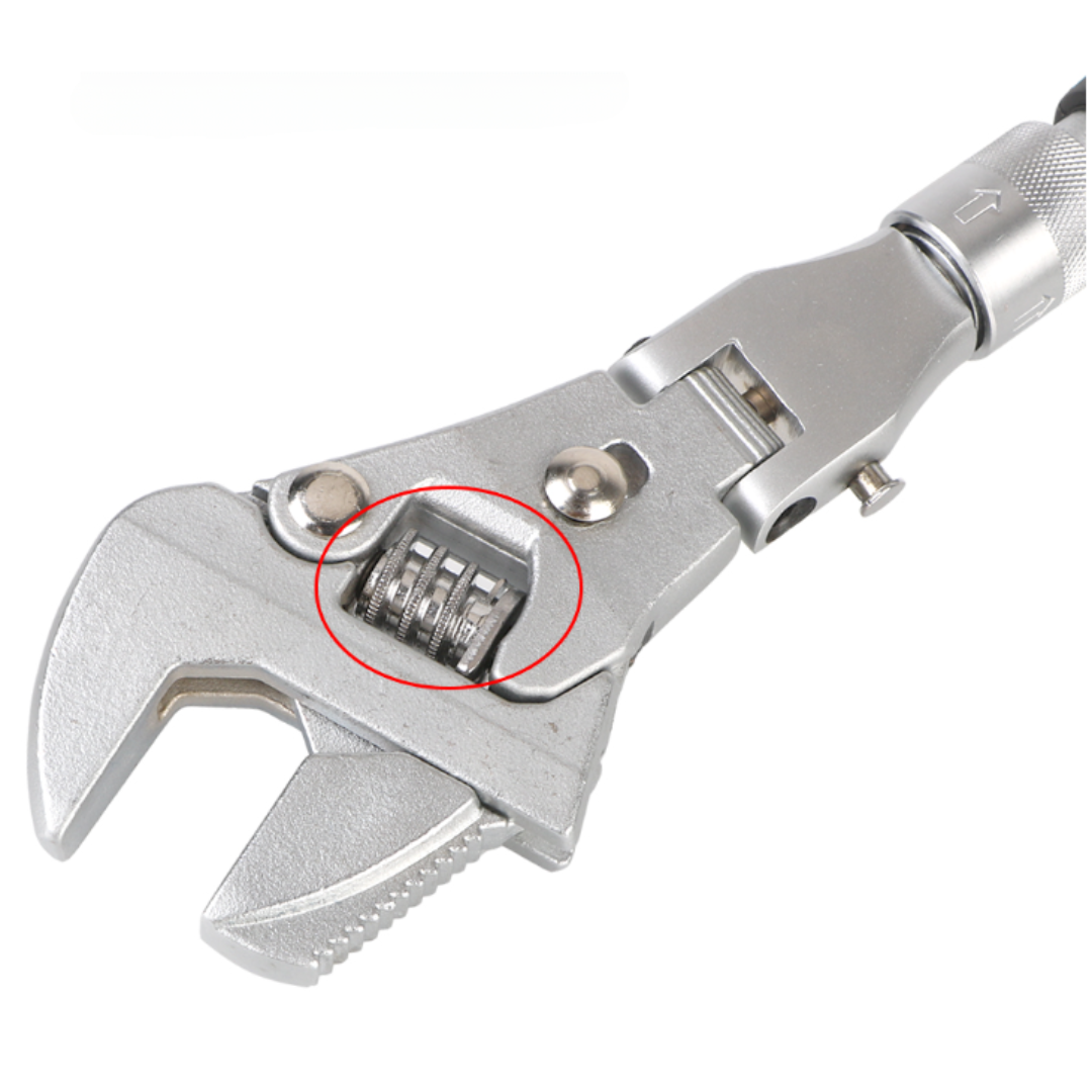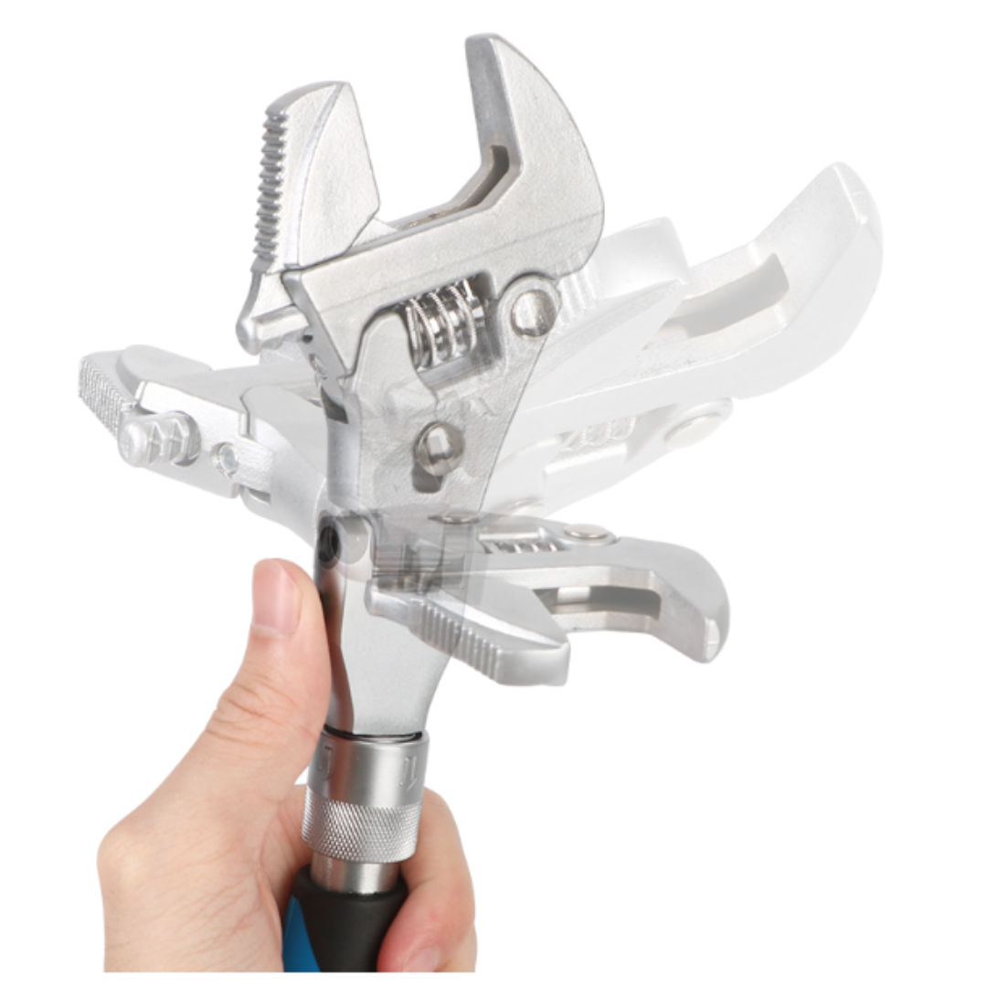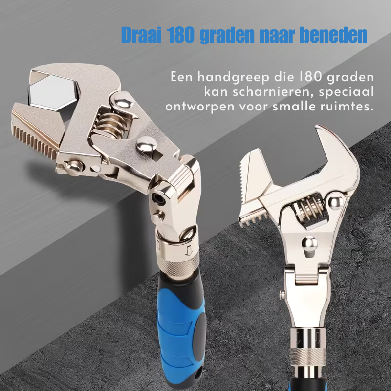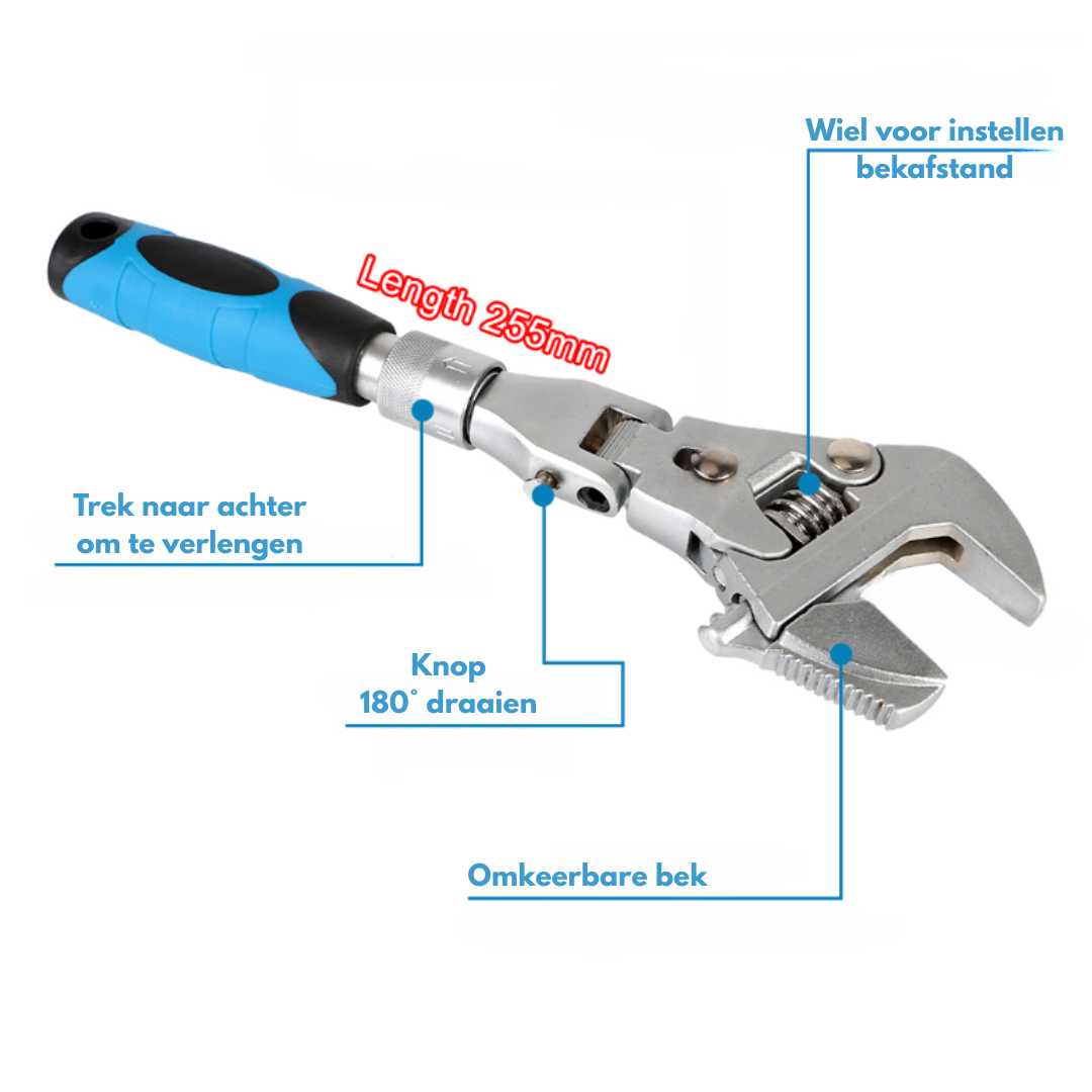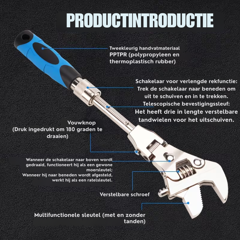 Deze sleutel combineert de functies van een verstelbare moersleutel, een ratelmoersleutel, een flexibele sleutel dankzij de 180° draaibare kop, een verlengde sleutel door de uitschuifbare functie, en een sleutel die geschikt is voor verschillende bout- en moermaten dankzij het verstelbare wormmechanisme.