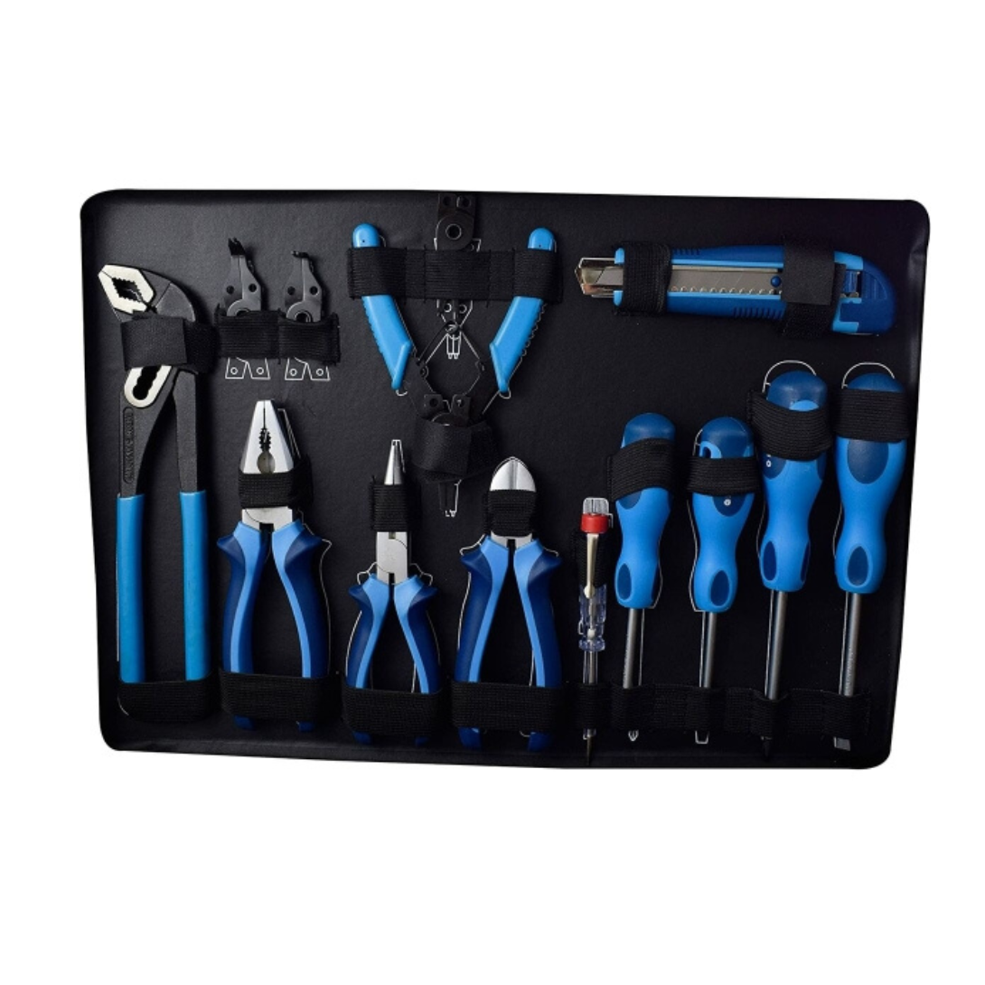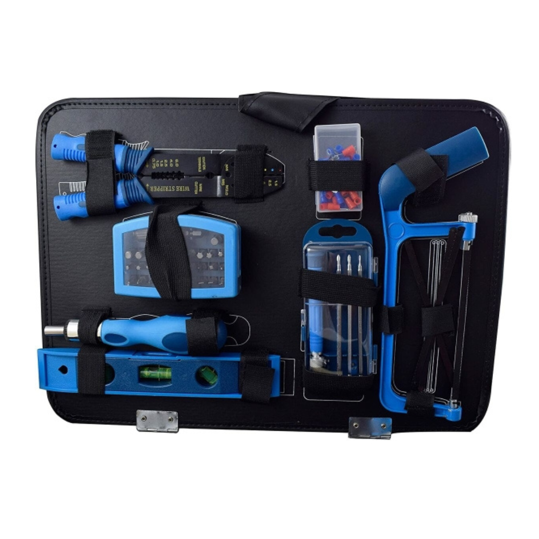 Je ziet de diversiteit aan tools, van tangen en schroevendraaiers tot zagen, hamers, sleutels en meer. De doordachte indeling in de stevige aluminium koffer zorgt ervoor dat elk gereedschap zijn eigen plek heeft, waardoor je snel vindt wat je nodig hebt en je werkplek georganiseerd blijft. Dit is de ideale basisuitrusting voor elke klusser, professional of doe-het-zelver die een complete en betrouwbare set zoekt.