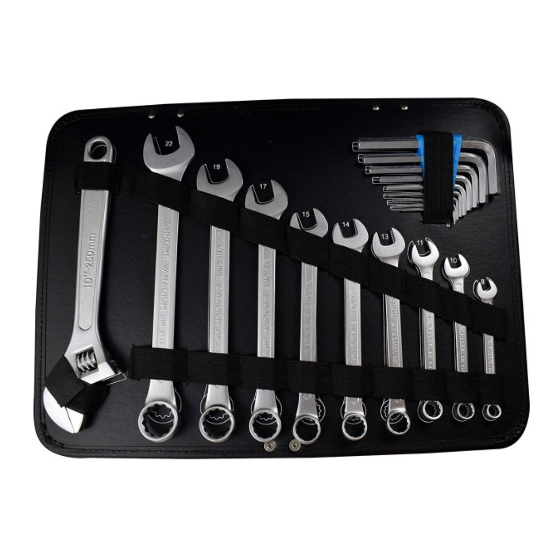 Deze detailopname toont de complete set steeksleutels die deel uitmaken van de 176-delige Ferrestock aluminium gereedschapskist. Je ziet de verschillende maten, netjes geordend en direct grijpbaar. Met deze uitgebreide selectie heb je voor vrijwel elke bout en moer de passende sleutel, waardoor je efficiënt en professioneel kunt werken aan diverse montage- en onderhoudsklusjes.